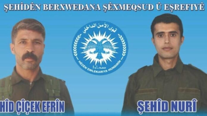 SYRIE – Le Commandement général des forces de sécurité intérieure (en kurde : asayiş) a annoncé que deux de ses membres, Çiçek Efrîn (Nûrî Mistefa) et Nûrî Hemokan, sont tombés en martyrs dans les attaques menées par les forces armées de Damas contre les quartiers kurdes de Cheikh Maqsoud et d’Achrafiyah, à Alep.
