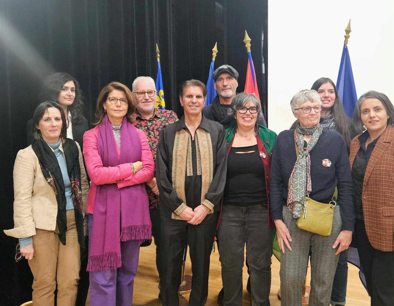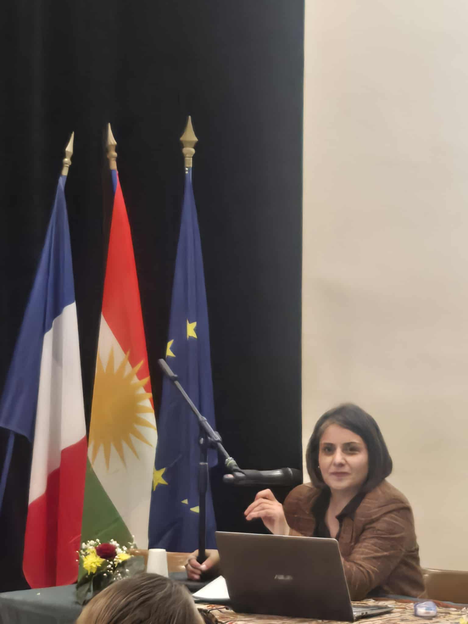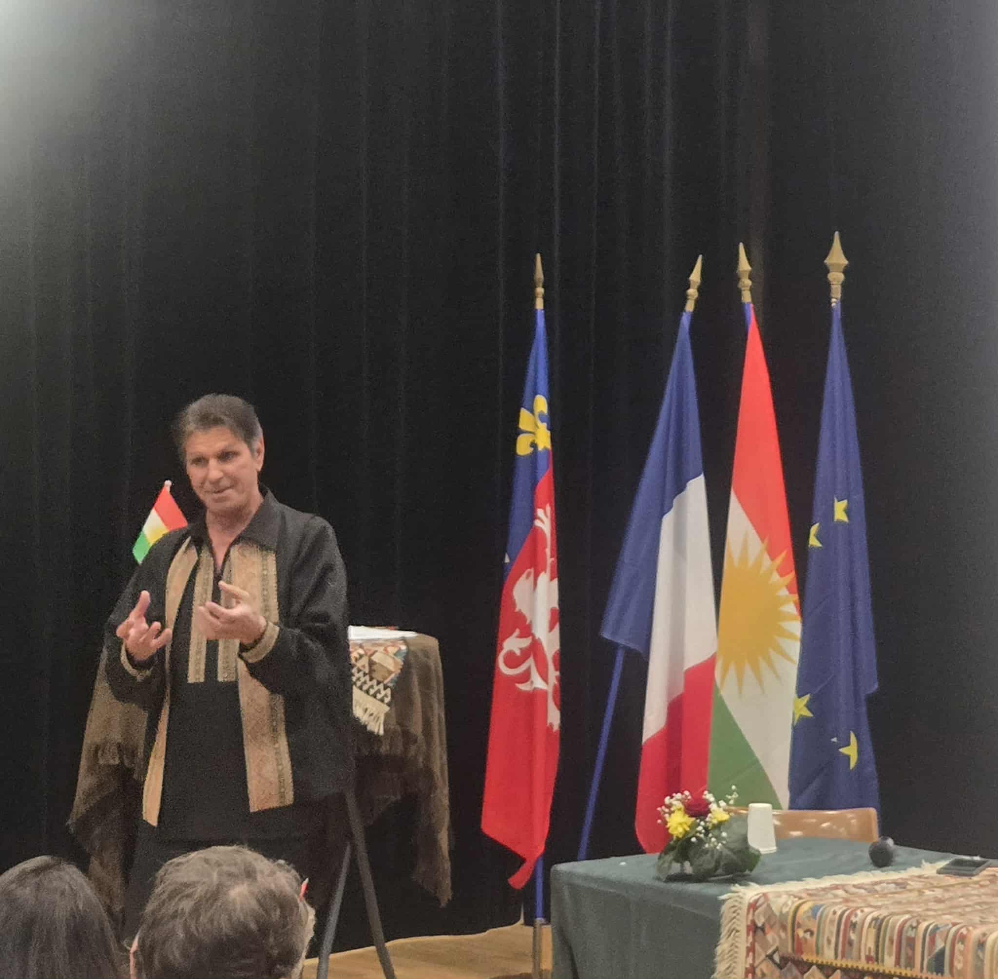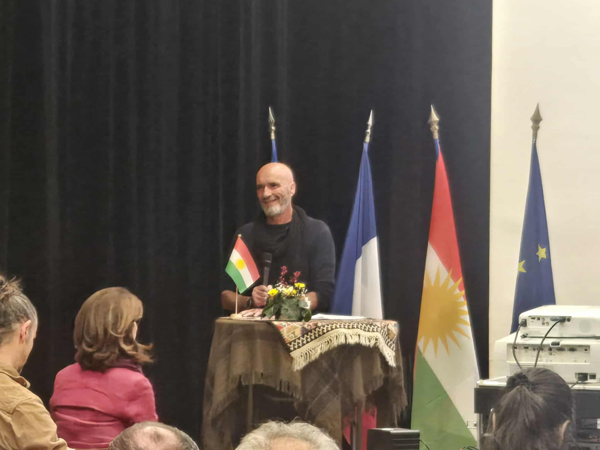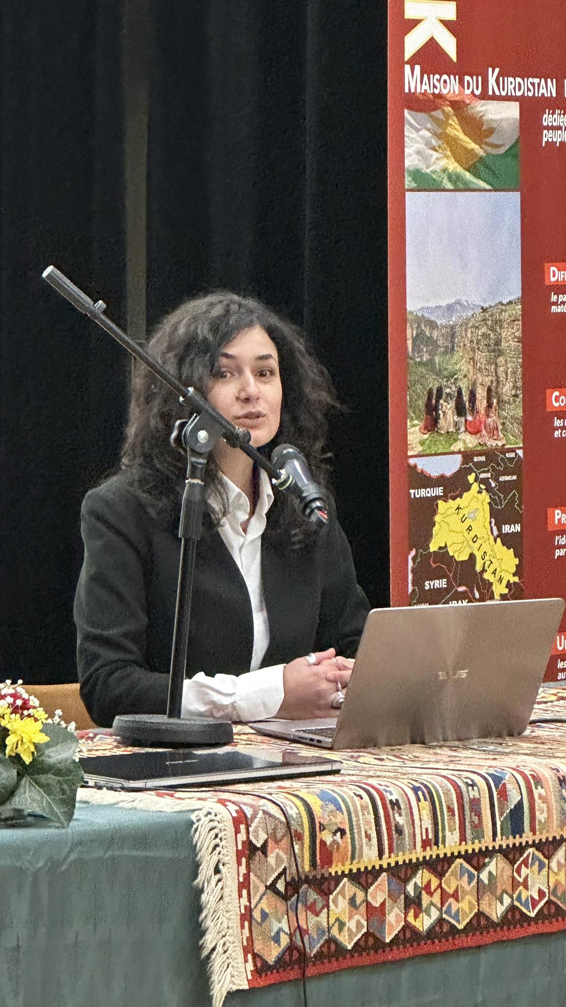 La 3ᵉ Journée de la Culture Kurde de Lyon placée sous le signe de la résistance, de la créativité et de la sensibilité avait comme intervenant·es Nazand Begikhani, poétesse, écrivaine et chercheuse qui a parlé de la poésie kurde ; Nesibe Acar, docteure en science du langage qui a parlé des célèbres tapis kurdes ; Miço Kendes, dengbêj, compositeur, joueur de buzuk qui a parlé de la musique kurde ; Pascal Béjeannin d’Art’situ qui a été au Rojava pour l’installation de l’« arbre de vie » réalisé à partir d’armes des guerriers qui ont combattu DAECH et qui fut installé sur un rond-point de Qamishlo et Floriane Kisa, artiste plasticienne dont les œuvres ont orné la salle de la conférence.
