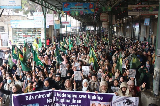 Des centaines de femmes de la région de l’Euphrate ont défilé pour condamner les massacres perpétrés contre les habitants de Sheikh Maqsoud, Achrafieh et Bani Zeid à Alep. Elles ont salué leur résistance et brandi des banderoles où l’on pouvait lire : « L’humanité doit rompre le silence » et « Non au meurtre des femmes et des enfants ».