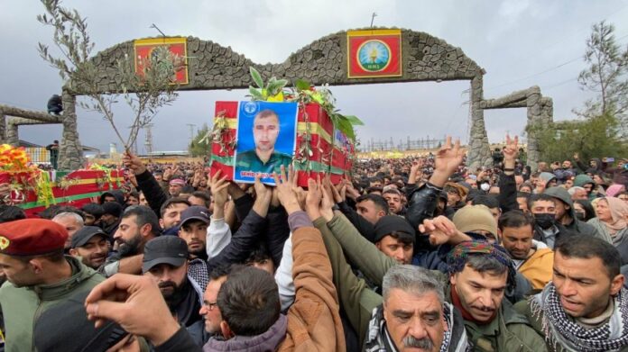 Le cortège funèbre du commandant martyr Ziyad Halab et des combattants Birûsk et Malek est arrivé au sanctuaire de la martyre Dijla, accompagné d’une foule nombreuse venue du nord et de l’est de la Syrie (Kurdes, Arabes, Syriaques et Arméniens). Le cortège est parti du centre des familles des martyrs pour rejoindre le sanctuaire du martyr Dijla, où s’est déroulée une cérémonie solennelle digne de leurs sacrifices.