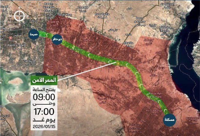 La chaîne d’information officielle syrienne, Syrian News Channel, a publié une carte annonçant la création d’un « couloir humanitaire de huit heures » pour les habitants des localités de Deir Hafir et Maskanah (à l’ouest de l’Euphrate, dans la campagne est d’Alep), toutes deux contrôlées par les Forces démocratiques syriennes (FDS). Ce couloir mènerait vers les zones contrôlées par les forces d’al-Jolani.
