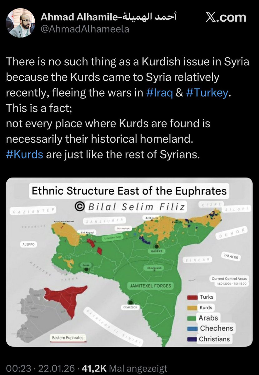 SYRIE / ROJAVA – Damas et Ankara propagent l’idée qu’il n’y pas de Kurdes en Syrie et ouvre la voie au nettoyage ethnique des Kurdes du Rojava (au passage, le Rojava est devenu turc). Pourtant, il y a quelques jours, al-Sharaa (Jolani) disait que les Kurdes faisaient partie intégrante de la Syrie. Maintenant qu’ils ont le feu vert de Trump pour massacrer les Kurdes, il peuvent réécrire l’histoire coloniale turco-ottomane !