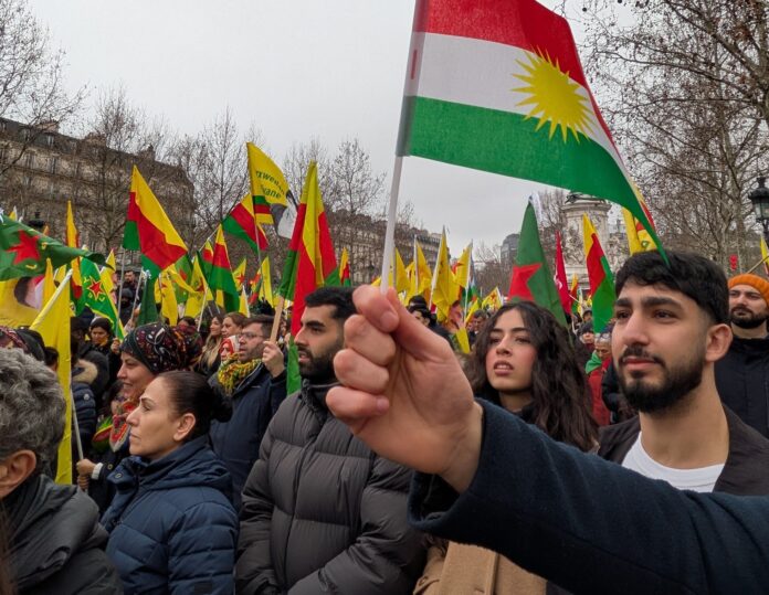 Parmi les orateurs réunis place de la Bastille figurait Murat Ceylan, membre du conseil d’administration du KCDK-E, la principale organisation européenne regroupant les institutions kurdes. Il a souligné que la lutte politique se poursuivrait jusqu’à ce que le Rojava et l’ensemble du Kurdistan obtiennent un statut juridique clair. « Notre peuple doit rester inébranlable, car nous connaissons l’histoire de nos ennemis », a déclaré Ceylan. La région est marquée par les luttes de pouvoir coloniales, aujourd’hui comme il y a un siècle.