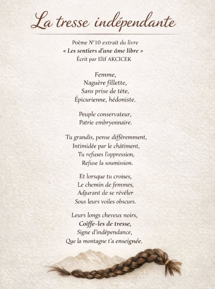« Les sentiers d’une âme libre » est un recueil de poésie de l’autrice Elif Léna AKCICEK dédié aux femmes kurdes. Il parle d’enfance, de conditionnement, de résistance silencieuse et de liberté conquise.
