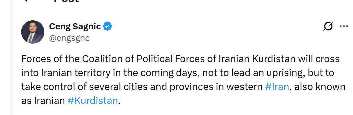 Ceng Sagnic a écrit ce matin, sur son compte Twitter (X) que « Les forces de la Coalition des forces politiques du Kurdistan iranien [basés au Kurdistan d’Irak] traverseront le territoire iranien dans les prochains jours, non pas pour mener un soulèvement, mais pour prendre le contrôle de plusieurs villes et provinces de l’ouest d’Iran, également connu sous le nom du Kurdistan d’Iran.